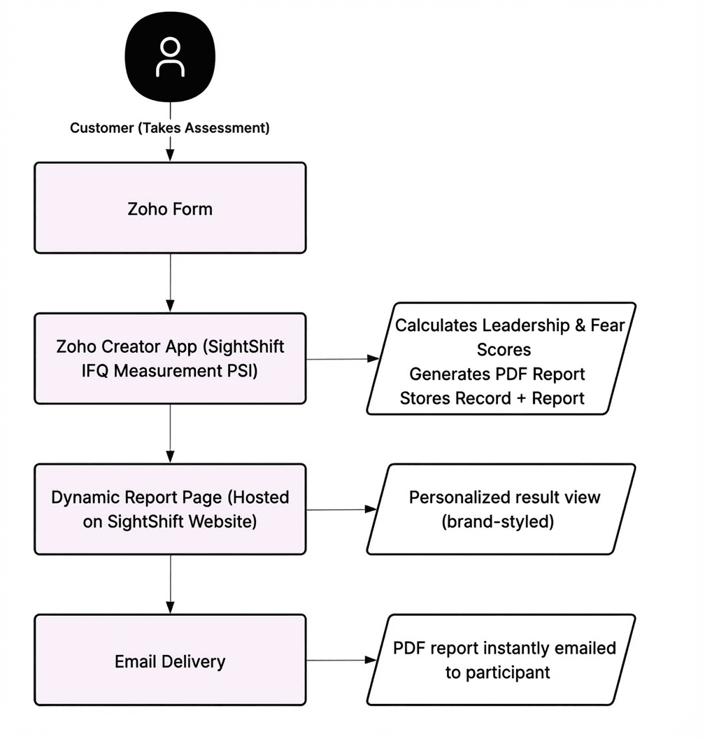 SightShift helps leaders build self-awareness and overcome insecurity through structured assessment tools and guided programs. To scale their Identity Fear Quotient (IFQ™) assessment and deliver instant personalized insights, the SightShift team partnered with us to develop a seamless digital workflow within the Zoho ecosystem.